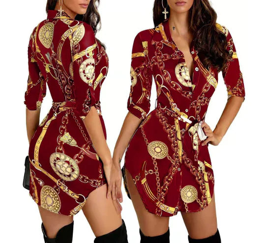 Crafted from high-quality polyester fiber, this dress is not only comfortable but also incredibly versatile. The digital printing technique ensures vibrant colors and intricate patterns that are sure to turn heads. The gold chain accents add an extra layer of allure, making it perfect for both casual outings and special occasions.