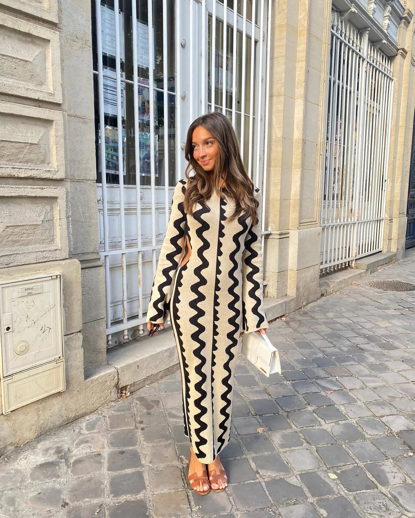 Wavy Slim Dress with Round Neck and Flared Sleeves